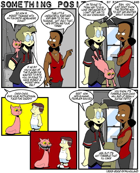 The Fluffy thing that once accompanied Samurai Jack, when He (Jack) gets suckered by the Hill-billy Bounty hunters it gets angry and turns into a mountain sized ferocious spiky killing machine that eats them in seconds, before shrinking back to it's regular fluufy self.